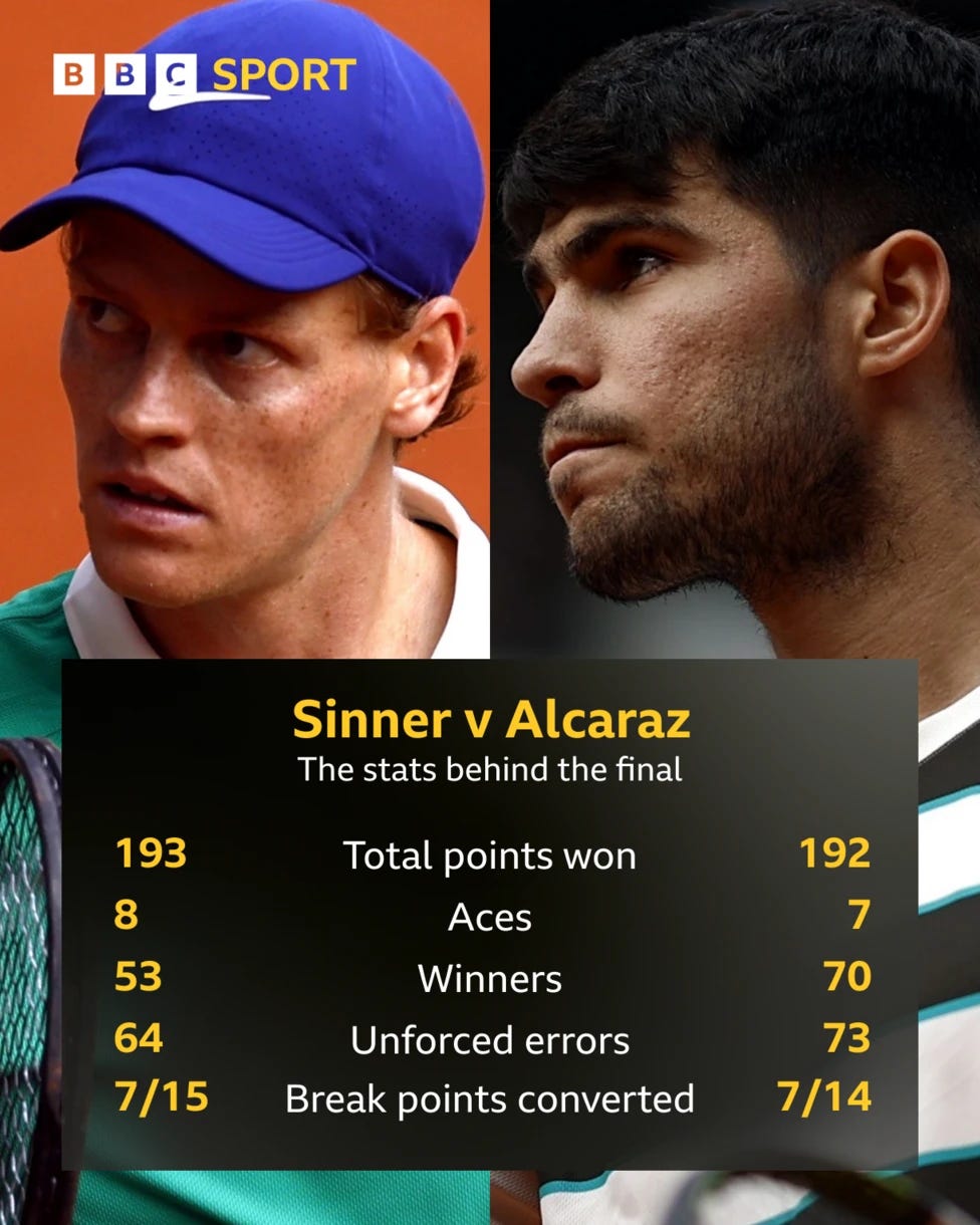 At that point, who understood cruelty better than Sinner? That statistic of him never winning a match that extends beyond 3 hours and 50 minutes will live on for a while longer, and it will conceal the how he played in the fifth and sixth hours of this Grand Slam final. You’ll have to read the fine print to know that Sinner, in many ways, had a better evening. In a match where neither opponent could truly be separated, Sinner even won one more point: 193 vs 192.
