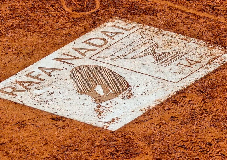Near the end of the ceremony, Nadal was joined on court by his three great rivals - Roger Federer, Novak Djokovic and Andy Murray - all in black blazers, immaculate. The ceremony ended with a final arrow to heart as the tournament director unveiled a plaque on the court with Nadal’s footprint. Court Philippe‑Chatrier will bear his stamp forever. Immortalised.