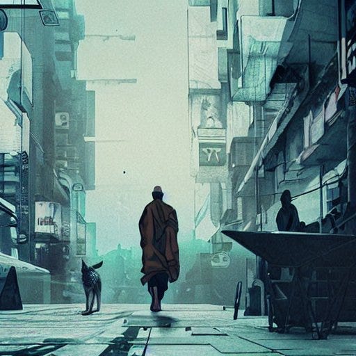 I can’t draw to save my life. But, like everyone else, I have ideas bouncing in my head that I wish somebody could do the actual craftwork for. So I asked Stable Diffusion to draw me Gandhi walking through a town in Bladerunner-universe while a wolf lurks nearby. I was completely sober. Honest.