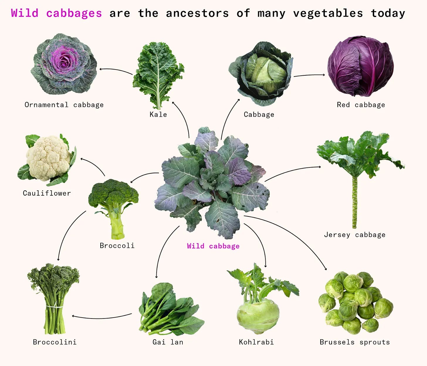 Taking a hard left from wine and cheese, Works In Progress has an essay about the history, journey, and influence of brassica oleracea, or the wild cabbage. The story is quite amazing. Most vegetables evolve with time, into versions that retain many characteristics from their ancestors. Not this guy.