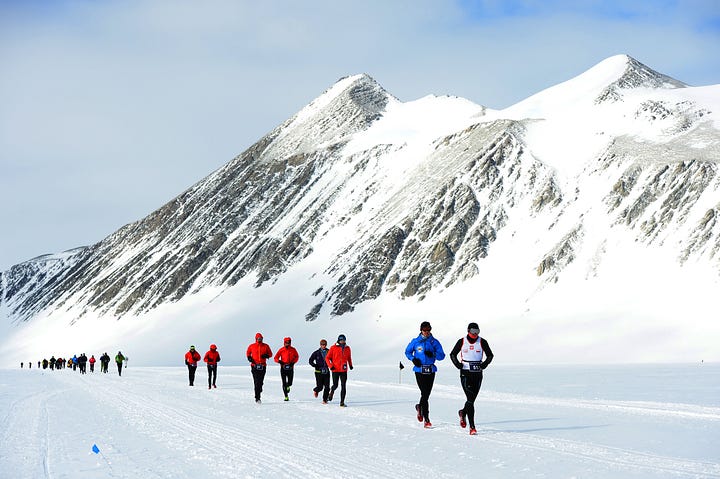 I knew tougher runs existed, of course. I had read about Mauro Prosperi getting lost in the Sahara for nine and a half days. Similarly, I knew about the Great Wall of China run and the Badwater 135 through the appropriately-named Death Valley. I had not, even while slingshotting my imagination to come up with unlikely routes, thought of a sequence of words with Antarctica and marathon near each other.