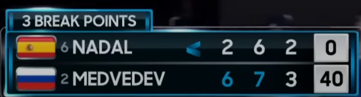 Two hours and a bit later, Medvedev was two sets and a break up. I suspect the organisers would’ve been preparing for the presentation ceremony at the time. At best, Nadal could win a couple of games from here.